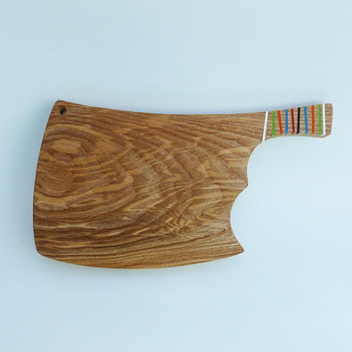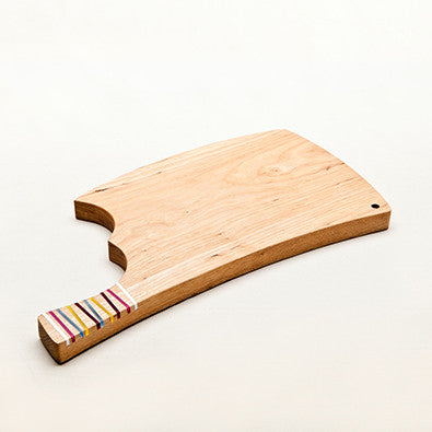 This quirky chopping board is available in white or native ash. The handle makes it really easy to pick up! It has10 decorative inlays in multi-colour acrylic. Happy chopping! Handmade in England.