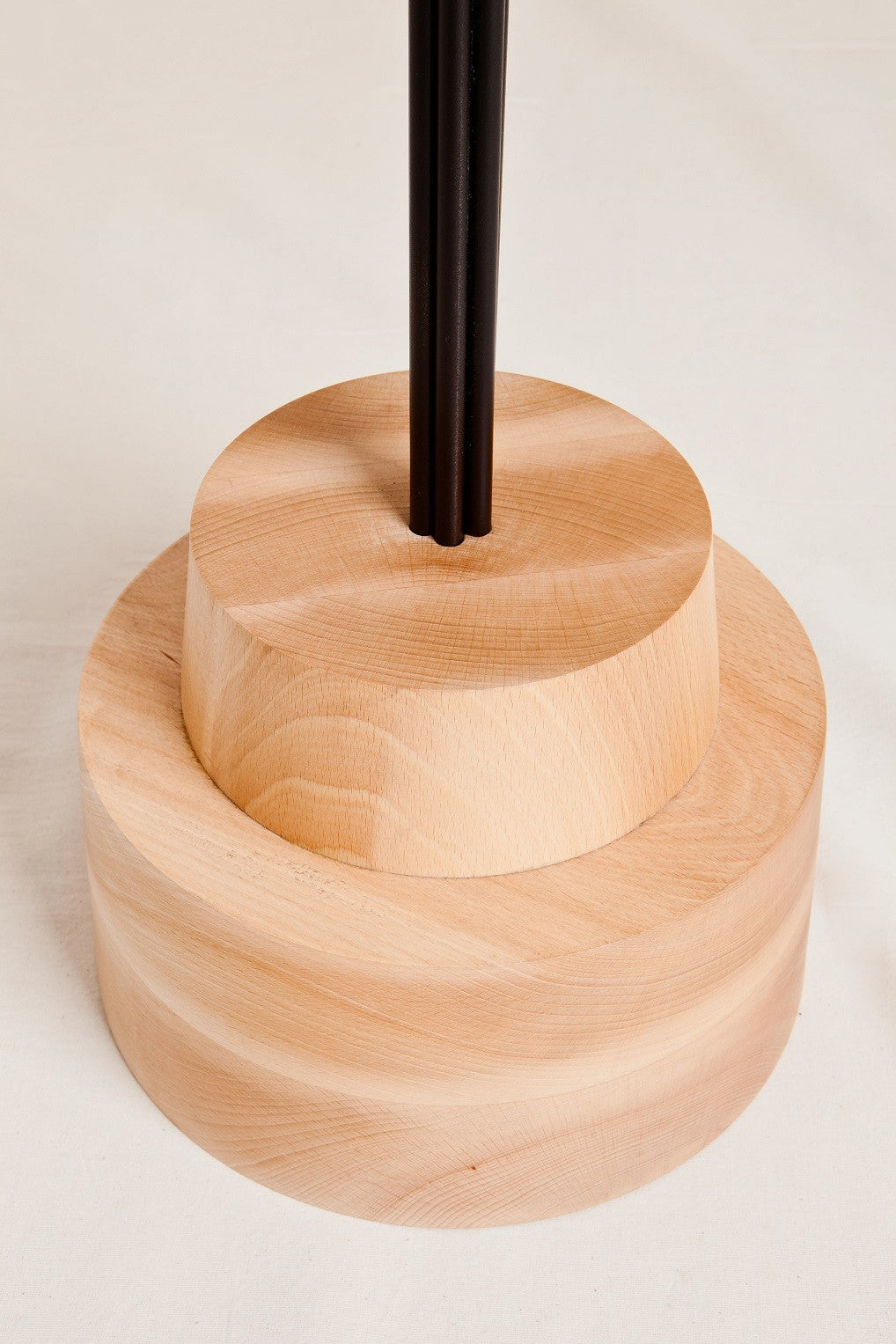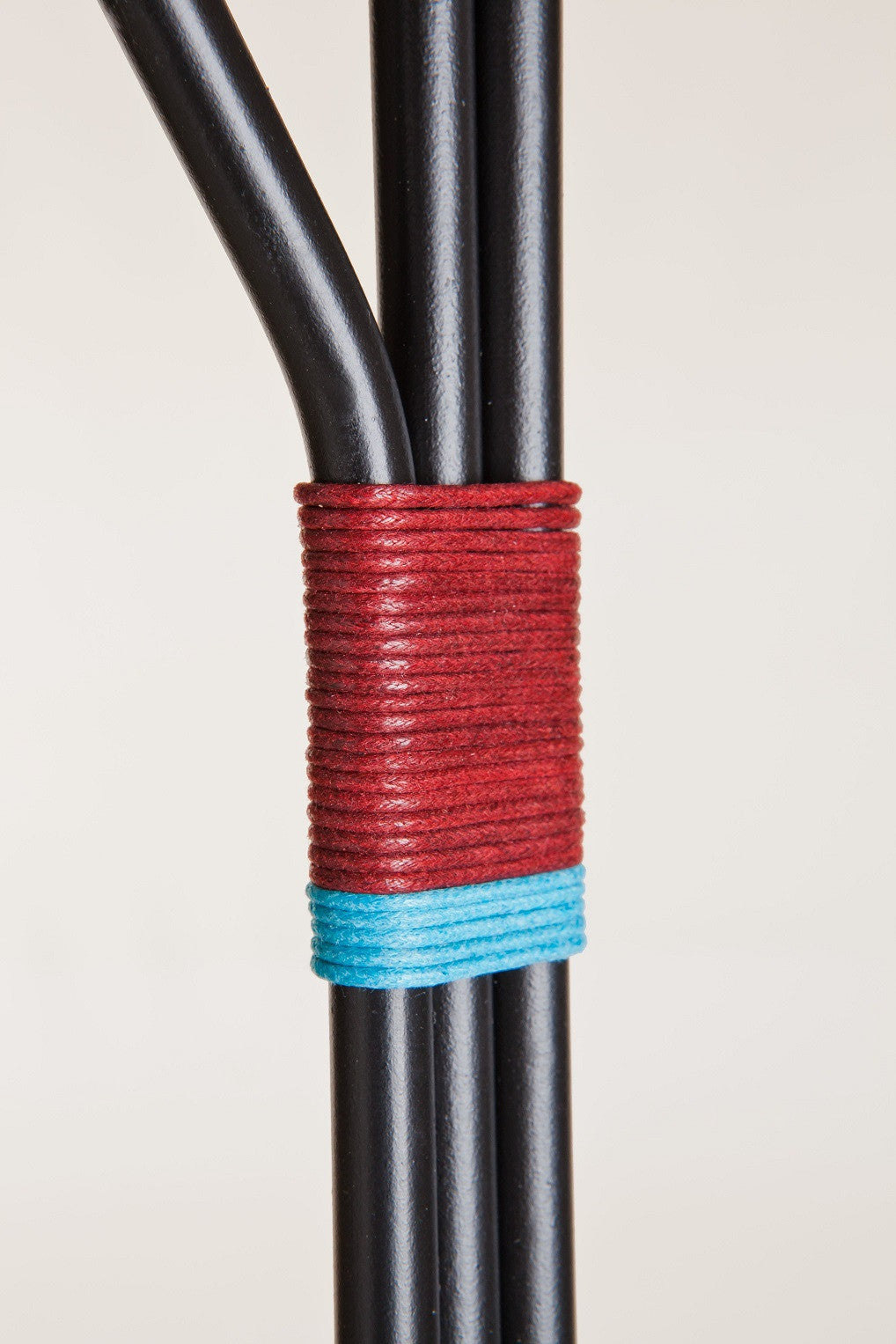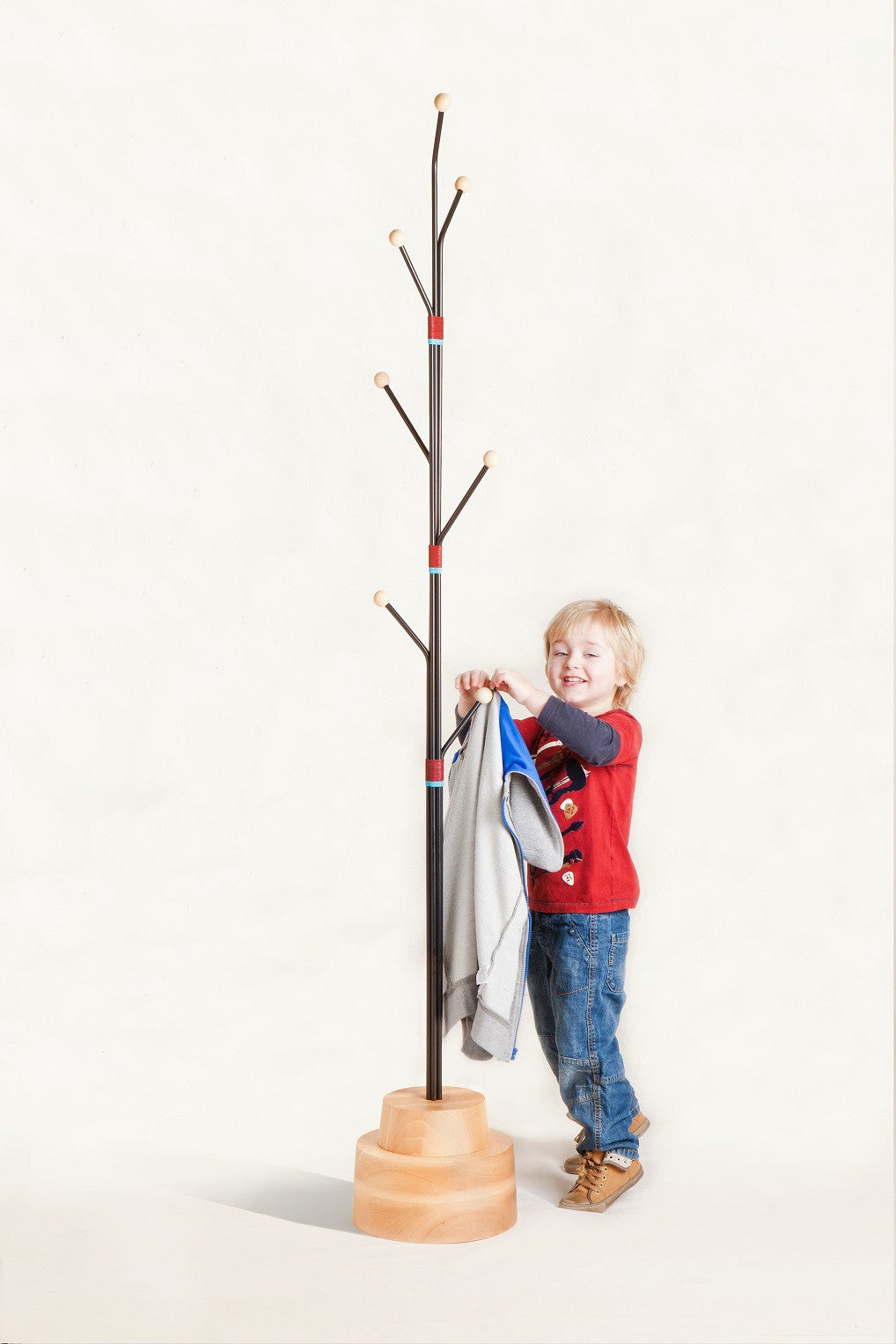This coatrack was designed with little people in mind. The base is made from beech and supports 7 steel rods. The rods, which are beautifully handcrafted into the base, have a powder coated finish and are topped off with wooden balls. An old sailor taught us how to lash all seven rods together adding a splash of colour. Ideal for a family hallway!