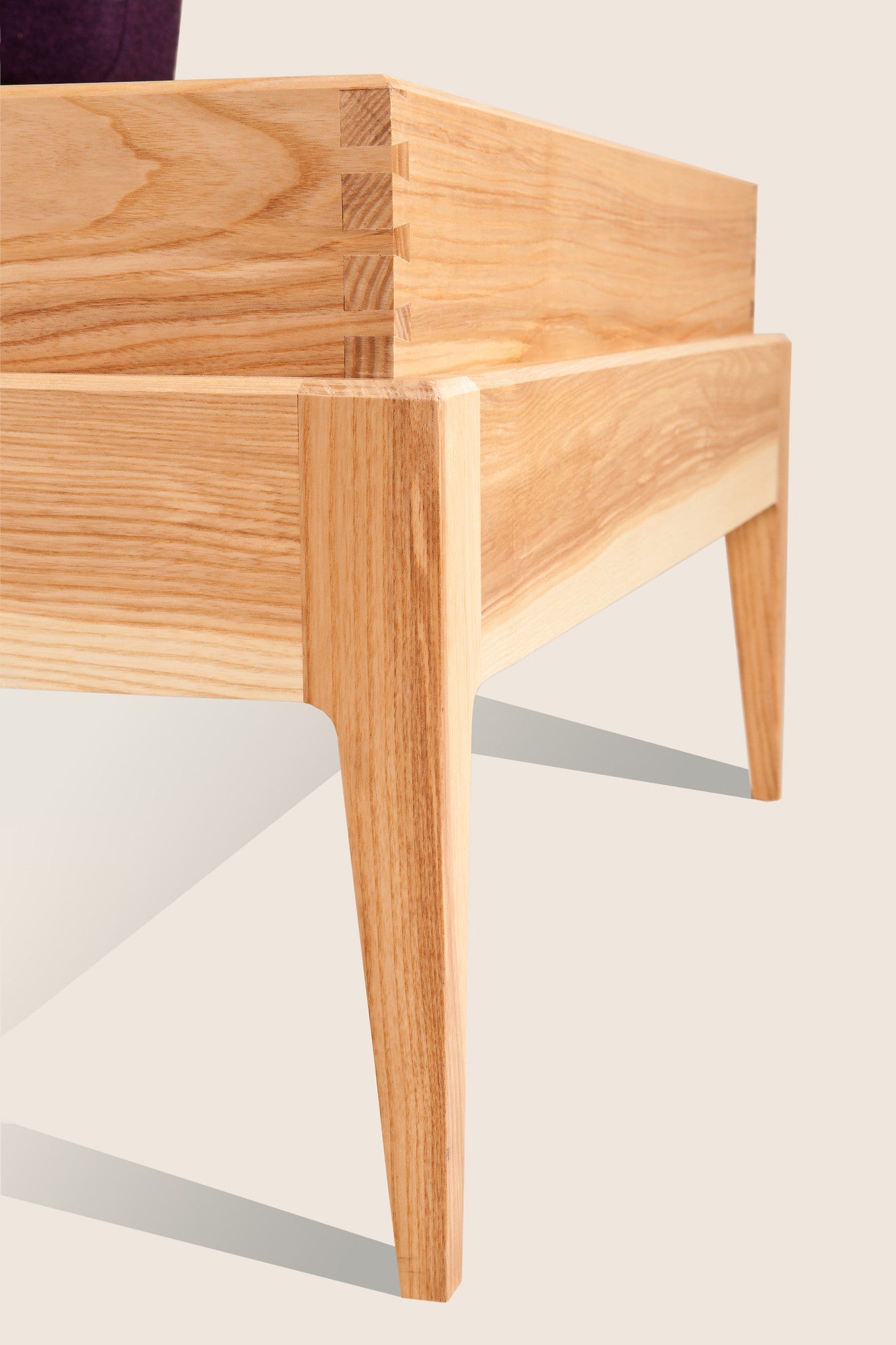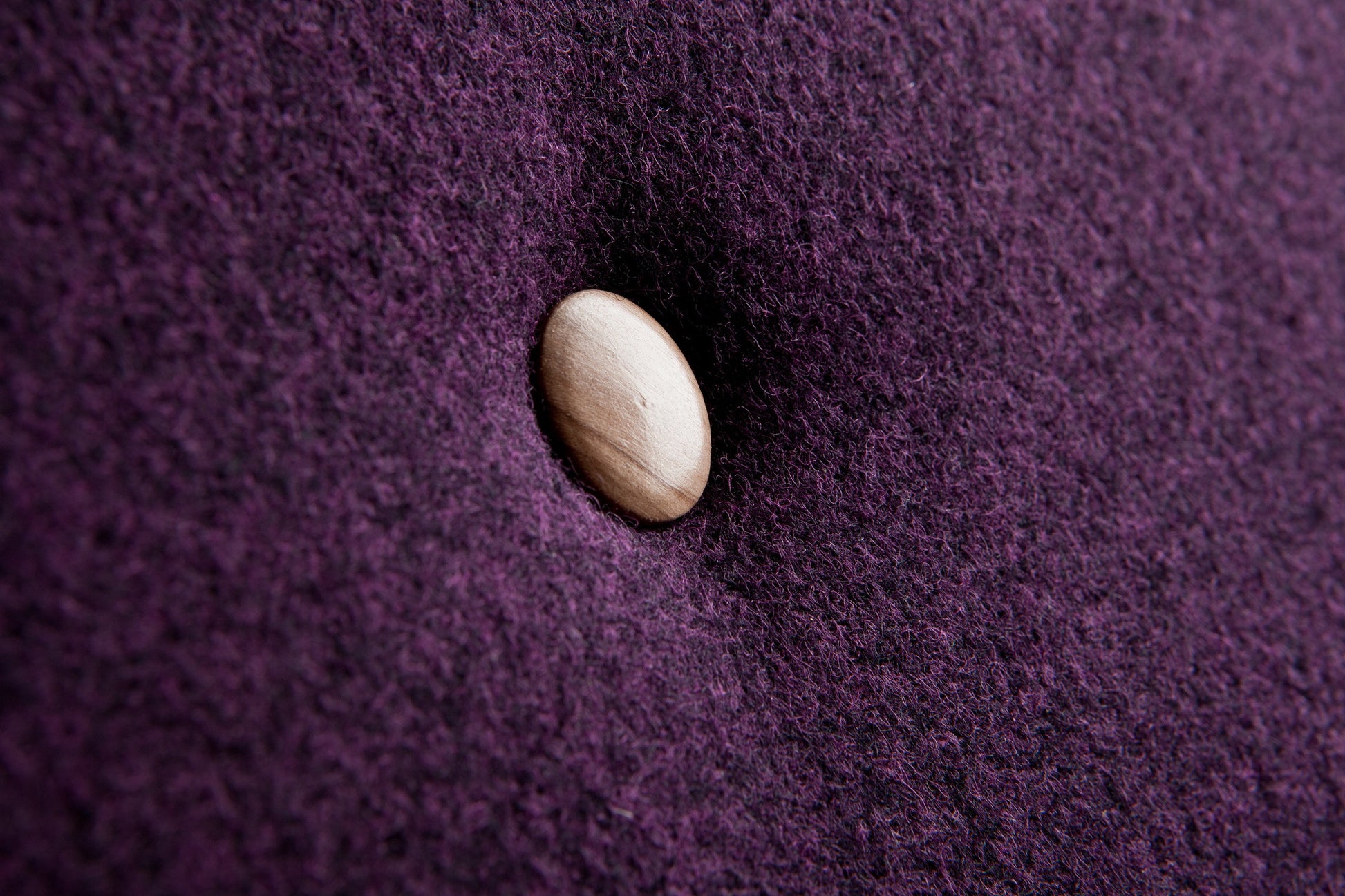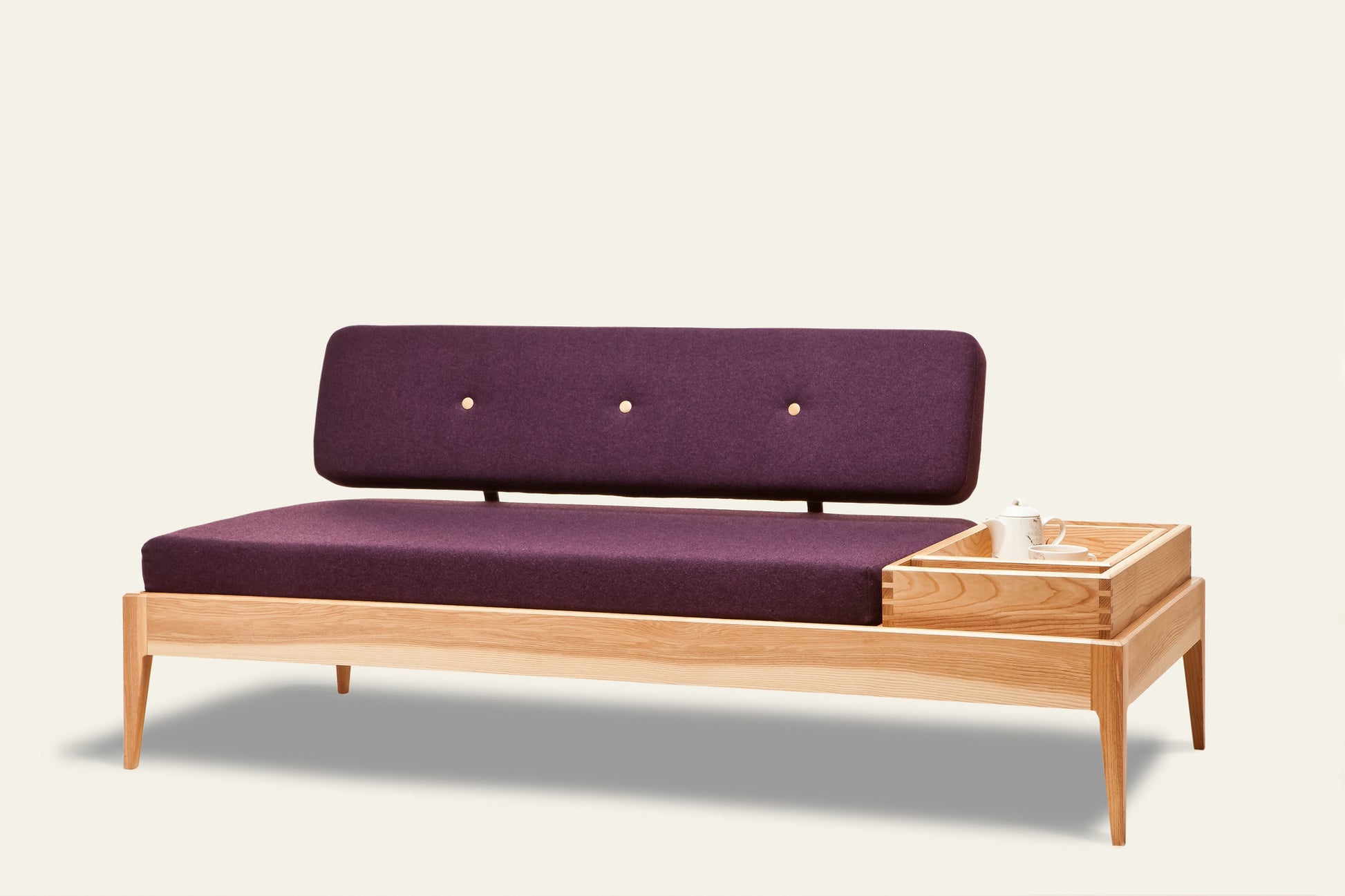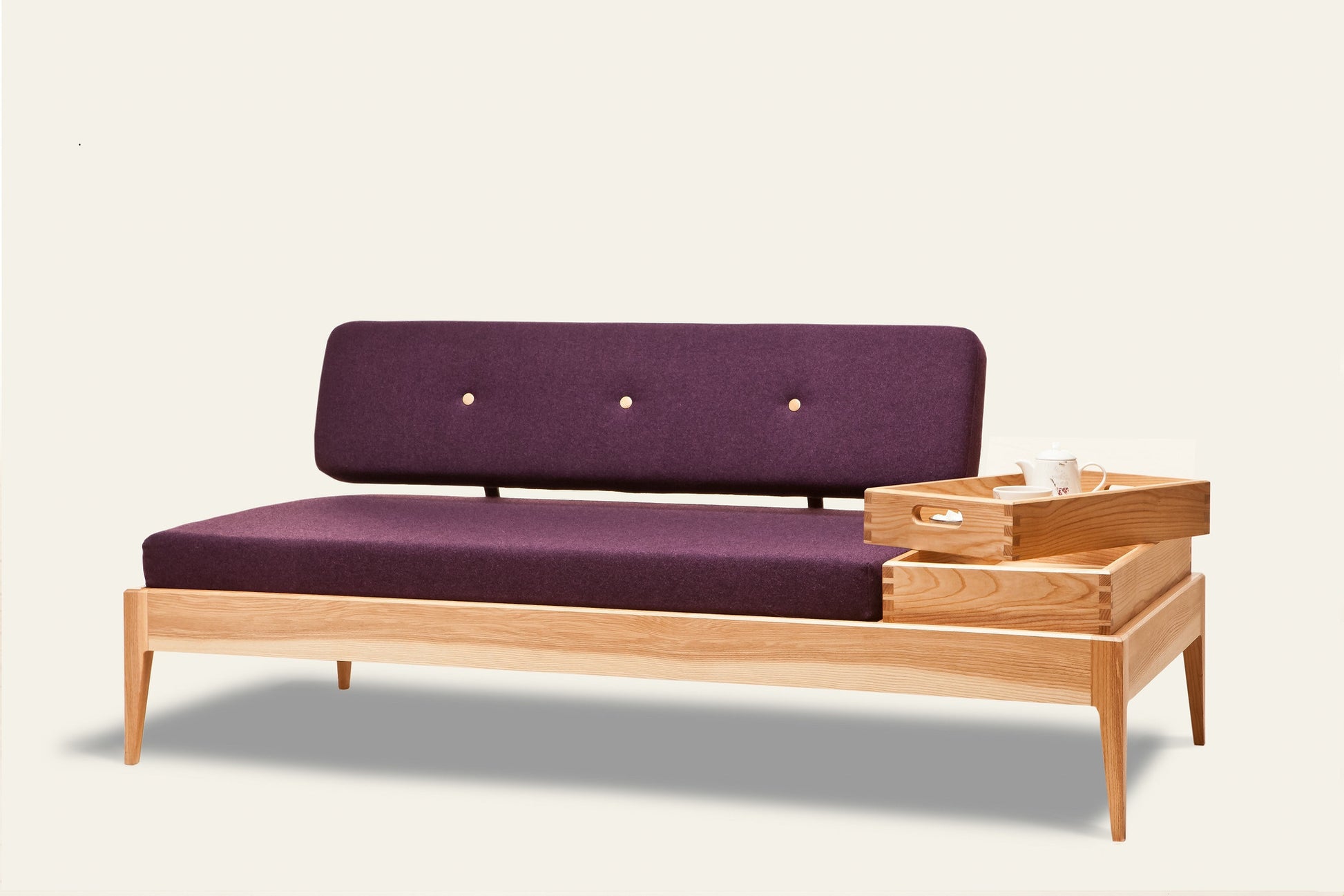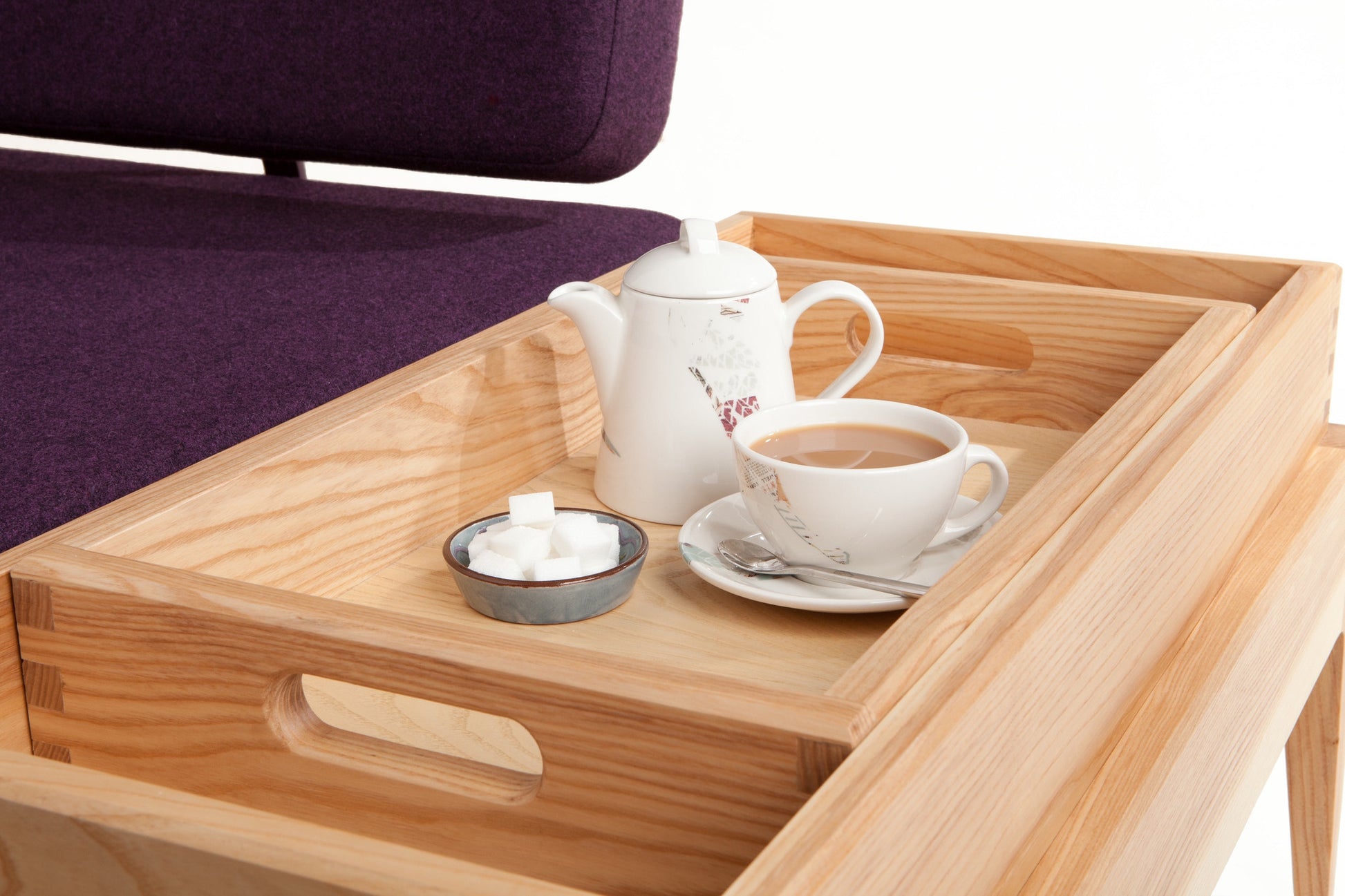 This beautiful handcrafted sofa was designed with function in mind. The frame is made from solid olive ash and incorporates a very handy pull out tray. It is upholstered in a sumptuous pure wool fabric with 3 wooden buttons.